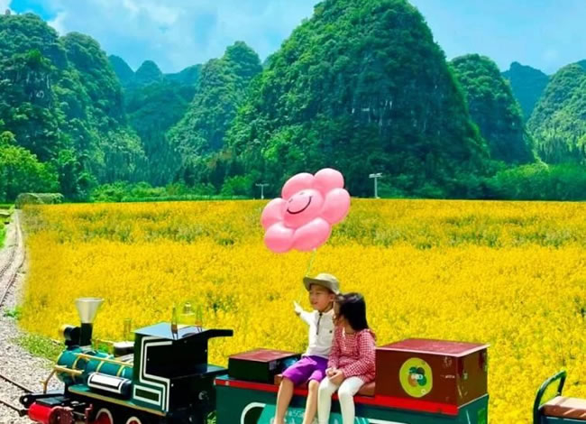 乘坐空調旅游觀光列車出發(fā),列車上來自興義的阿哥阿妹帶領大家感受濃濃 的布依族風情,一起載歌載舞,感受春日的美好浪漫。