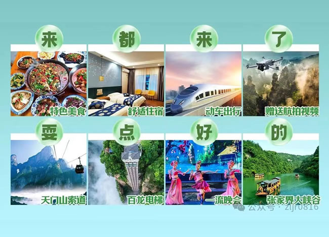 門(mén)票:張家界國(guó)家森林公園、百龍電梯單程、張家界大峽谷、天門(mén)山國(guó)家森林公園+時(shí)光扶梯單段+玻璃棧道一次性鞋套費(fèi)用、張家界土司城(或老院子)、湘西苗寨、鳳凰古城接駁車、張家界民俗晚會(huì);